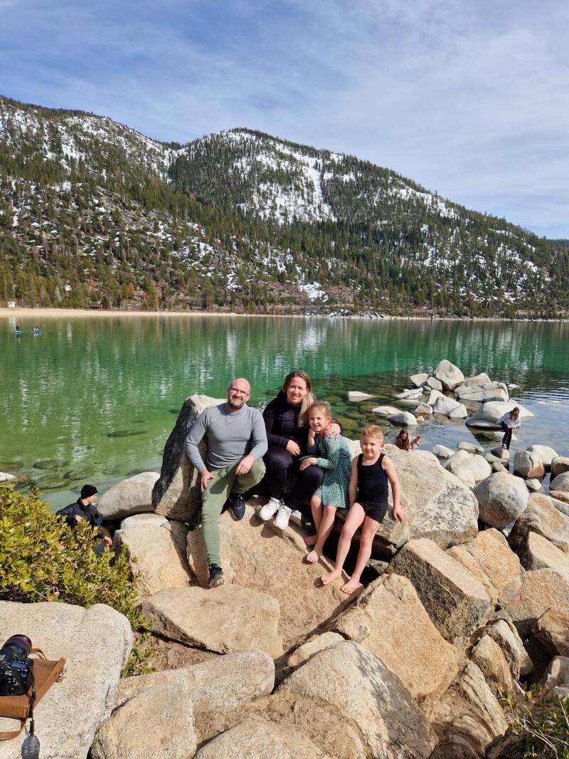 Lake Tahoe ligt op een hoogte van 1898 meter in de Sierra Nevada. Op de grens tussen de staten Californië en Nevada. Het is het grootste bergmeer en op een na diepste meer van de Verenigde Staten. Het meer is zo'n 35 km lang en 19 km breed. Negen jaar geleden hebben we de Californische kant bezocht, nu gaan we naar het noorden. Omdat we wat tijd over hebben kunnen we nog een bezoek brengen aan Sand Harbor Beach. Dit is een van de mooiste baaien van Lake Tahoe door zijn kristal heldere blauwe water, rotsen en gele stranden. Het weer is heel aangenaam, de kindjes kunnen zelfs in het water spelen. Op zich een rare gewaarwording aangezien we omringd zijn door besneeuwde bergen en hier en daar op het stand ook nog wat sneeuw te vinden is.