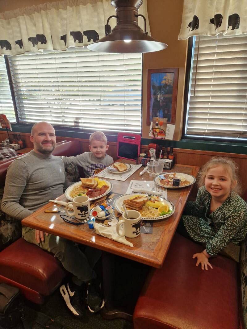 Na een uurtje rijden stoppen we bij de "Black Bear Diner" om te ontbijten. Deze kennen we uit vorige rondreizen. Naast dat je er lekker kan ontbijten is het er ook erg mooi aangekleed, helemaal in de sfeer van de regio Californië. Zoals de naam al doet vermoeden zijn de uit hout gekerfde zwarte beren volop aanwezig, dit tot groot genoegen van Logan die bijna met elke beer wil knuffelen. We genieten allemaal van ons eerste typische Amerikaanse ontbijt.