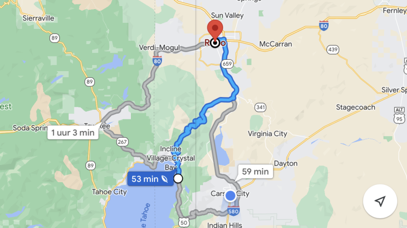 We vervolgen onze reis naar Reno. Vanuit de bergen van Virginia city dalen we in een mooie route met wederom besneeuwde bergen af naar het dal. In de verte zien we de hotels en casino's al liggen. De bijnaam voor Reno is "The Biggest Little City in the World". In de praktijk is het de 112ste grote stad met bijna 220.000 inwoners. Na Las Vegas is het de tweede gokstad in de staat Nevada.