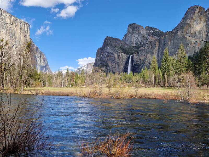 Yosemite staat bekend om zijn watervallen. De Yosemite Fall is de hoogste waterval van Noord-Amerika en bestaat uit een bovenste waterval en een lagere waterval (739 meter hoog). Ter vergelijking het Empire State Building is 381 meter hoog. We maken een wandeling naar de voet van de lagere waterval. Deze is volgens de ranger ideaal voor kinderen. Een bospad slingert langs een riviertje door de bossen. De kinderen vinden het een avontuurlijke route. Ze spelen verstoppertje achter de dikke boomstammen en verzamelen stokken. Logan durft het zelfs aan om met mij over een boomstam te lopen die over de rivier ligt.