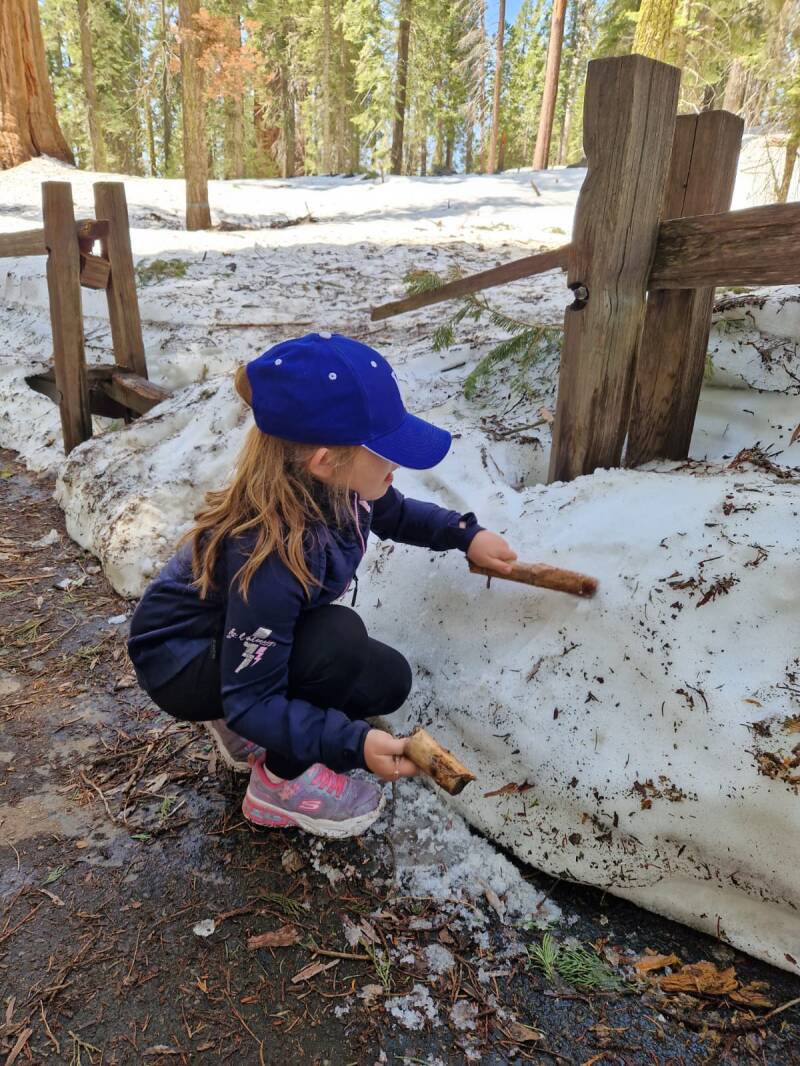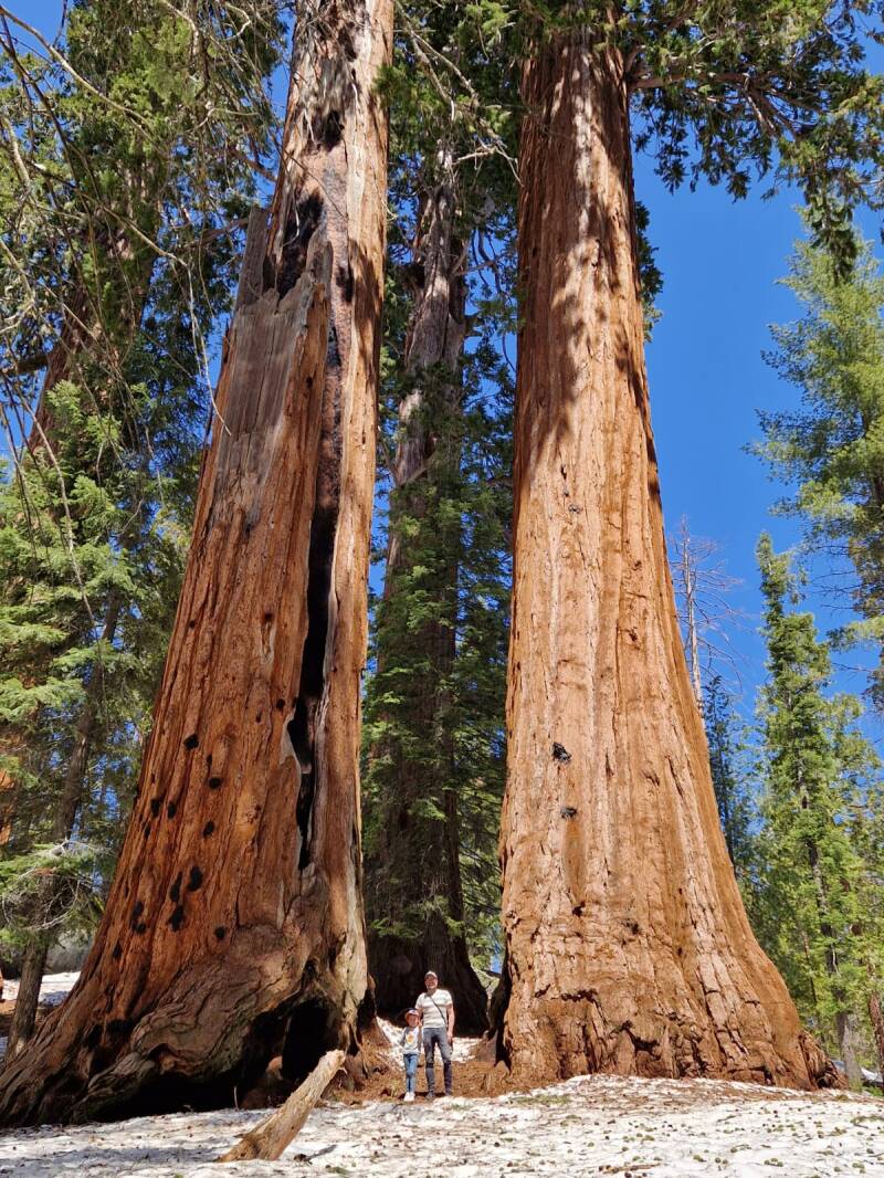 De dames vinden het wel prima en gaan terug naar de auto. Samen met Logan ga ik nog een stukje klimmen naar een sequoia boven op een besneeuwde berg. Voor elke twee stappen omhoog glijden we er eentje terug. Logan vind het super spannend en als we boven zijn is hij trots op zich zelf. Terug gaan we glijdend op onze billen de berg weer af. Uiteindelijk was het lekker wandelen zo tussen die reuzen, zo nu en dan maakte we een uit glijder over de smeltende sneeuw. Al met al een goede keuze om wat extra uurtjes in de auto te zitten.