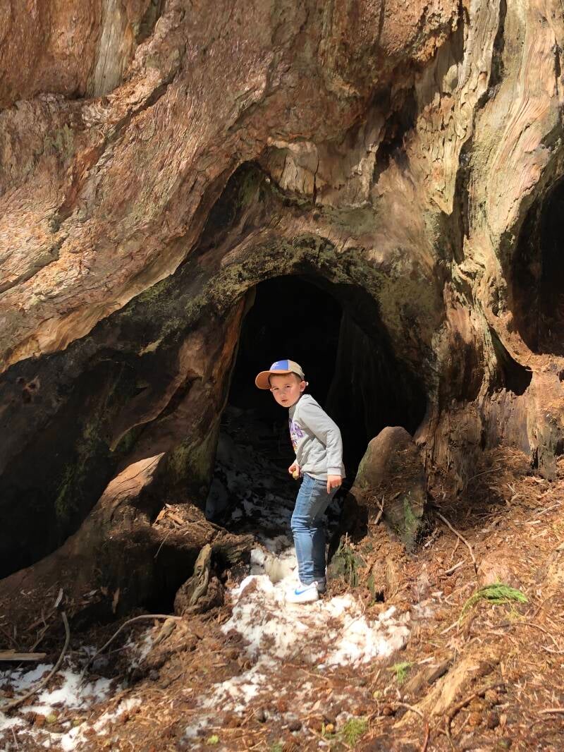 Als we de weg vervolgen komen we een omgevallen sequoia tegen genaamd "the Fallen Monarch". Deze ligt er al meer dan 100 jaar. Hij is van binnen helemaal hol en er loopt nu een voetpad doorheen. De kids vinden dit maar al te spannend.